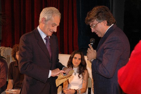 Il prof. Giovanni Castagna, presidente della Giuria Tecnica, apre la busta contenente il nome della lirica vincitrice 2004, assistito dal giornalista Amedeo Romano.